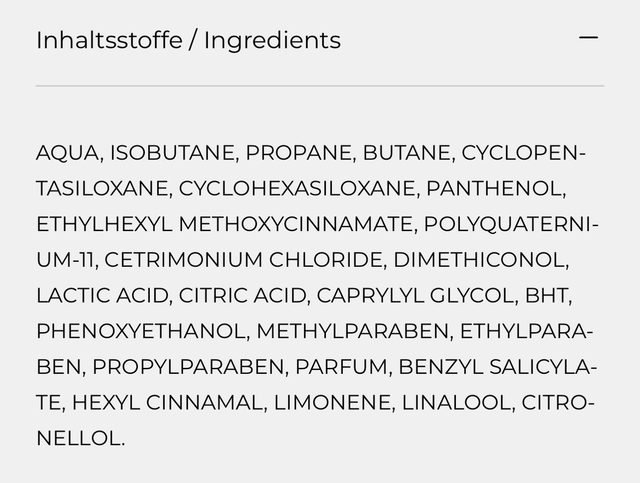 Anwendung: Gut schütteln. Schaumkopf nach unten richten. Nach der Haarwäsche eine tennisballgroße Menge im handtuchtrockenem Haar verteilen, durchkämmen und wie gewohnt frisieren. Nicht ausspülen!
